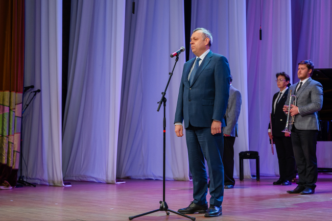 А далее в большом зале горожан встречал Оркестр духовой и эстрадной музыки, исполнивший гимн России.