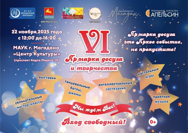 Организаторы шестой Ярмарки досуга и творчества: Молодежный меридиан, Мэрия города Магадана, Центр культуры, Магаданский интеллектуальный клуб «Энергия разума», рекламное агентство «Апельсин» и рекламно-информационный журнал «Магадан».