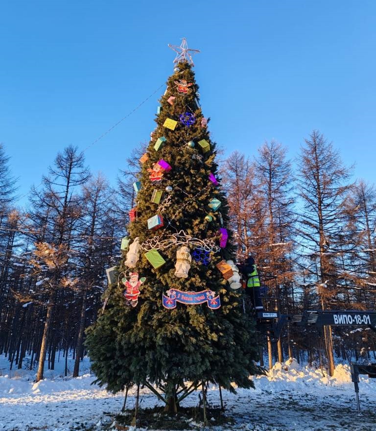 Новогодняя зеленая красавица украсила поселок Уптар в Магадане