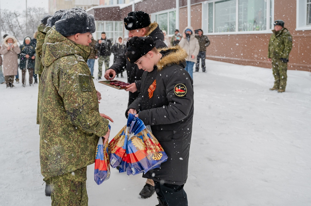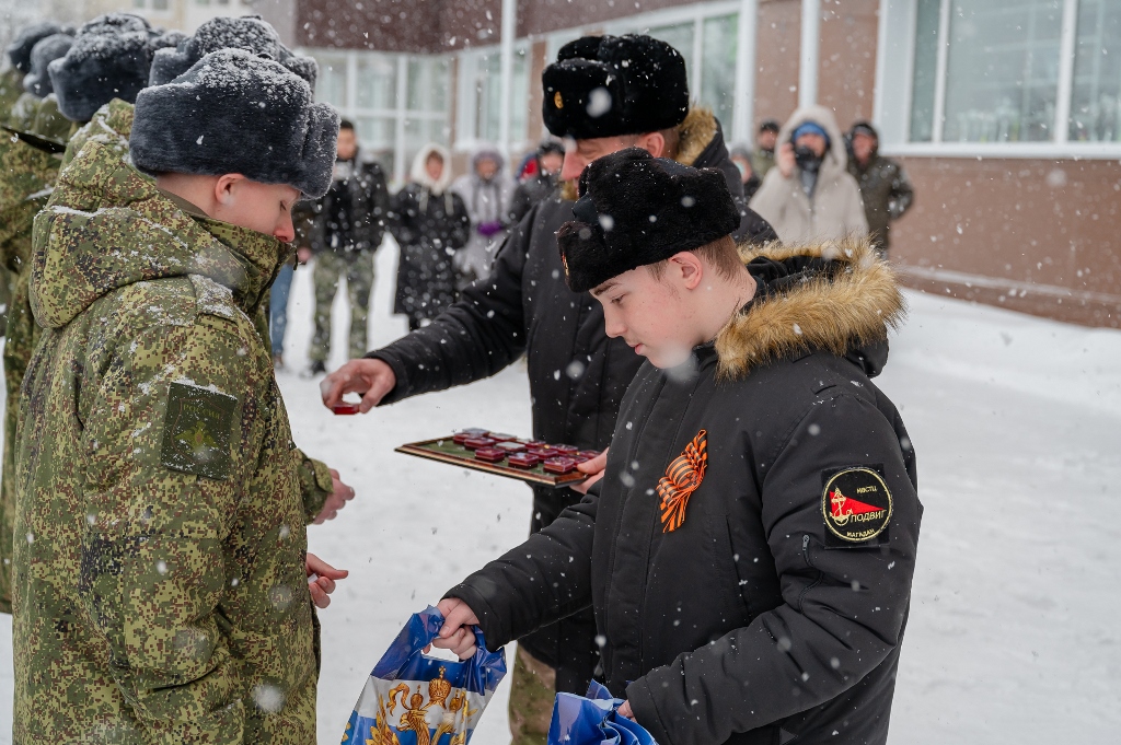 Курсанты клуба «Подвиг» вручили защитникам Родины памятные знаки и подарки от мэрии города.