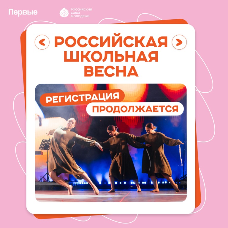 В России дан старт новому сезону «Российской школьной весны» – крупнейшего фестиваля ученического творчества. Это флагманский проект Общероссийского общественно-государственного движения детей и молодежи «Движение Первых» и Общероссийской общественной организации «Российский Союз Молодежи» (РСМ). Масштабное событие, входящее в Программу поддержки и развития молодёжного творчества «Российская студенческая весна», вновь объединит тысячи талантливых школьников в возрасте от 12 до 18 лет со всех регионов России.