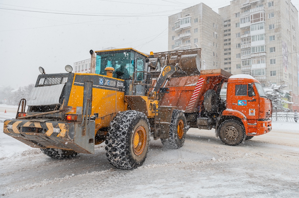 Фронтальные погрузчики и самосвалы грузят снег, расчищают заезды, остановочные карманы, вывозят снег на Нагаевской, Пролетарской, Карла Маркса.